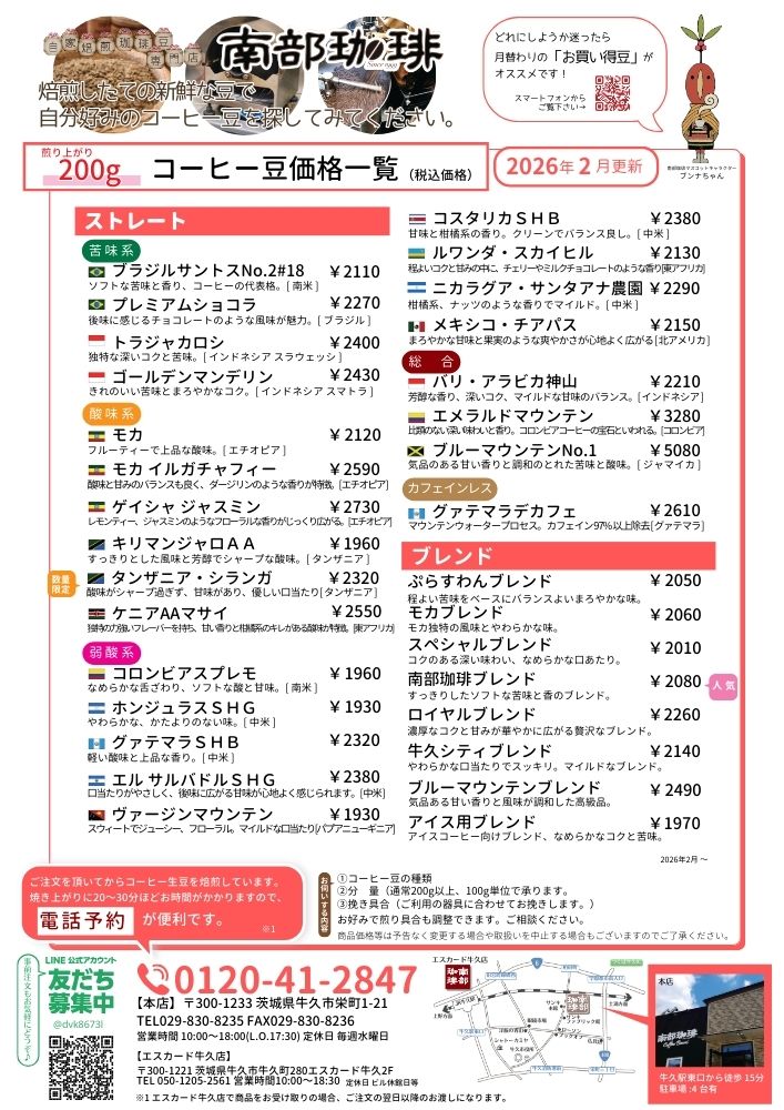 南部珈琲エスカード牛久店公式HPでやSNS等で最新のお知らせをご確認ください。